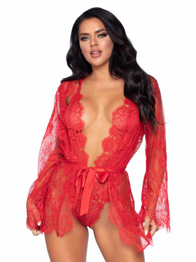 Get lost in the romance of this gorgeous 3 PC lingerie teddy and lace robe set by Leg Avenue. The flirty lingerie set features a plunging bodysuit teddy with adjustable straps and thong panty, lace short robe with scalloped trim, and satin ribbon tie closure.
