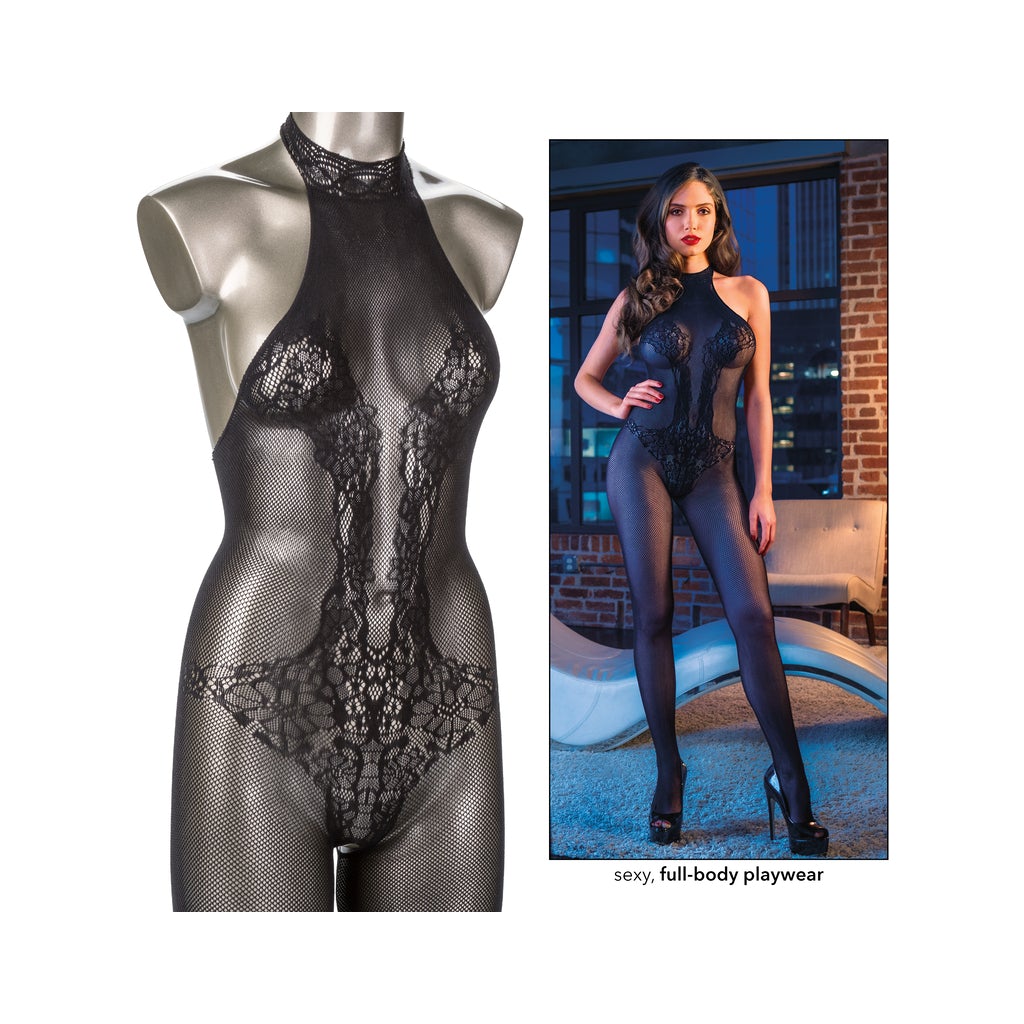 Watch as your lover melts at the sight of you in the Scandal® Halter Lace Bodysuit, a lace full body lingerie piece created with a sexy lace pattern and halter neckline to sensually accentuate your curves. The soft stretchy lace and bold crotch-less design are perfect for hours of passion pleasure play. Surrender yourself to your partner's every whim and indulge in unrestricted pleasure with the sinfully crotchless design. Give into primal desire, inspire new passions and indulge in scandalous pleasure with this seductive full-body ensemble.