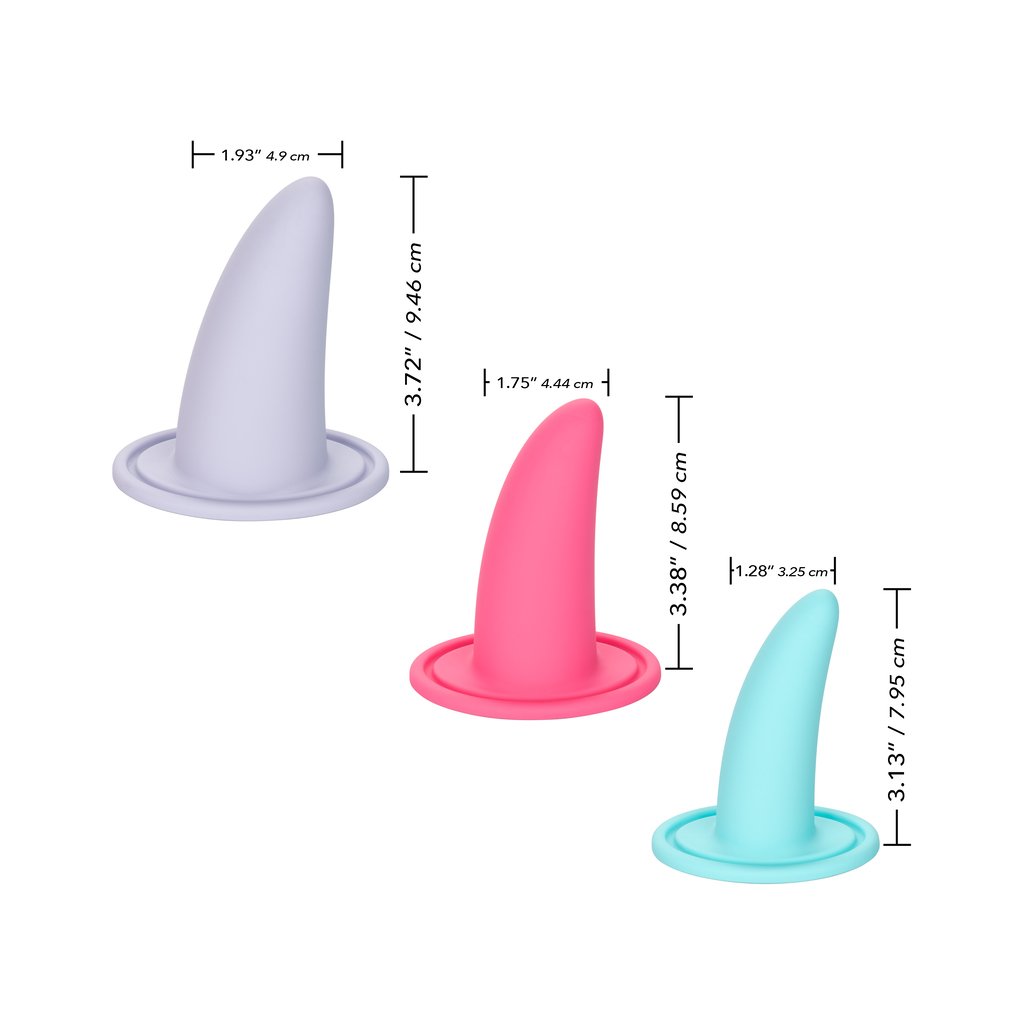 Revitalize and strengthen vaginal muscles with the contoured She-ology Advanced 3-Piece Wearable Vaginal Dilator Set. The uniquely designed 3-piece dilator kit is ergonomically curved and gradually sized to allow for gentle dilation. The advanced size silicone probes have a curved base for gentle insertion and stimulation, pair with a mini bullet for intensified sensation! The graduated set has been created to revive vaginal muscle strength and reduce insertion discomfort with every use. Use the small dilator to begin and as you gentle exerciser and increase the elasticity of muscles, advance to the larger probes. With unique wearable design, each probe is finished with a flexible flanged base for comfort and easy of mobility. The hypoallergenic premium silicone is body safe, unscented and phthalate free to keep you most sensitive spots, happy and healthy. Measurements 3.13 x 1.28 / 7.95cm x 3.25cm (Dilator 1) 3.38 x 1.75 / 8.59cm x 4.44cm (Dilator 2) 3.72 x 1.93 / 9.46cm x 4.9cm (Dilator 3). One Year Warranty.
